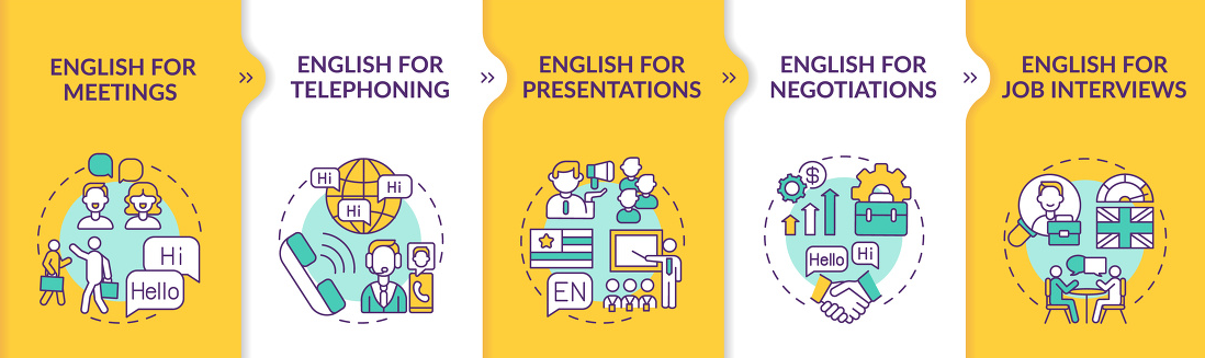 Übungen zur Sprachfertigkeit, Small talk, allgemeine Präsentationen, Präsentation von Diagrammen, Tabellen und Zahlen, Vorstellungsgespräche, Teilnahme an Meetings, Telefontraining einschließlich Telefonkonferenzen, Verhandlungen, diplomatische Redewendungen, interkulturelles Training, Firmen auf einer Messe vertreten, Besucher betreuen, Englisch für (Geschäfts-)Reisen.